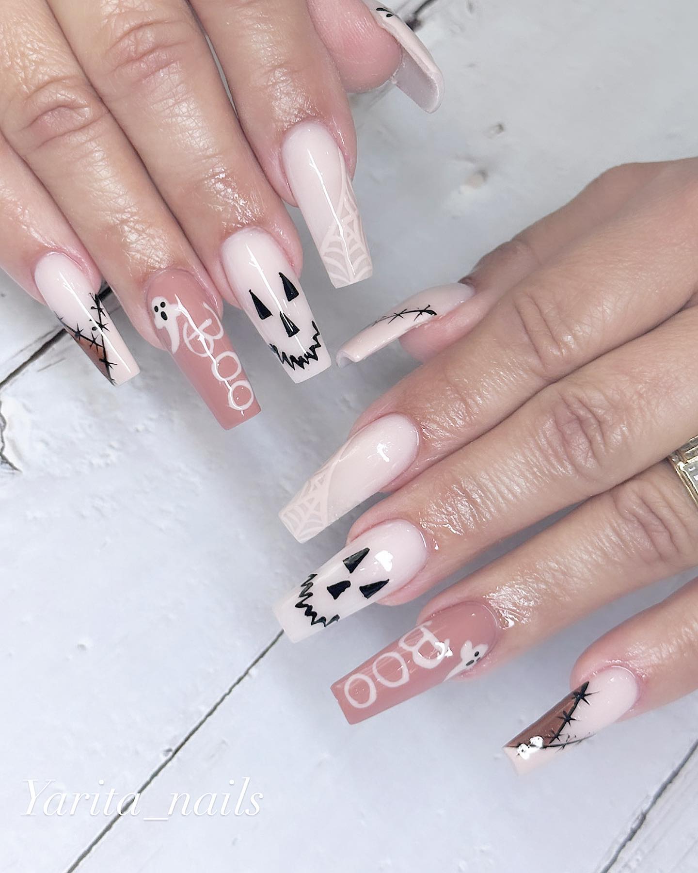 This nail design has the typical spiderweb, ghosts, etc Halloween designs on this light nude base that gives it a nice neutral finish. If you prefer Halloween nails that aren’t dark-themed, you should consider this nail design.